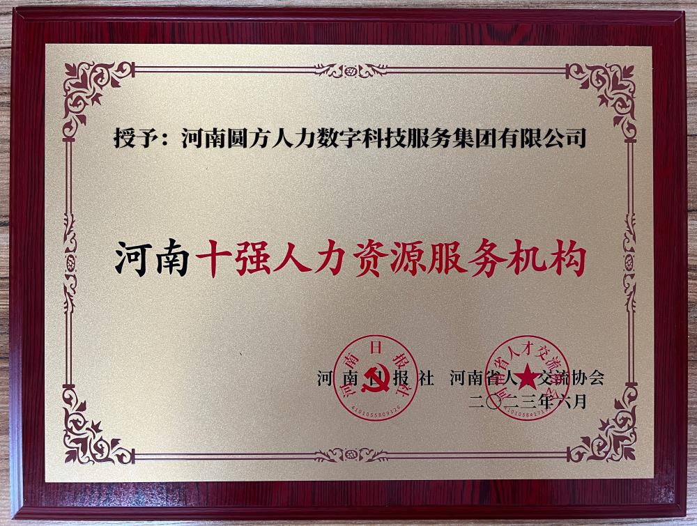 2023年6月15日,由河南日報社、河南省人才交流協(xié)會(huì )聯(lián)合主辦的河南人才論壇在鄭州舉行,河南圓方人力數字科技服務(wù)集團有限公司榮獲“河南十強人力資源服務(wù)機構”榮譽(yù)。