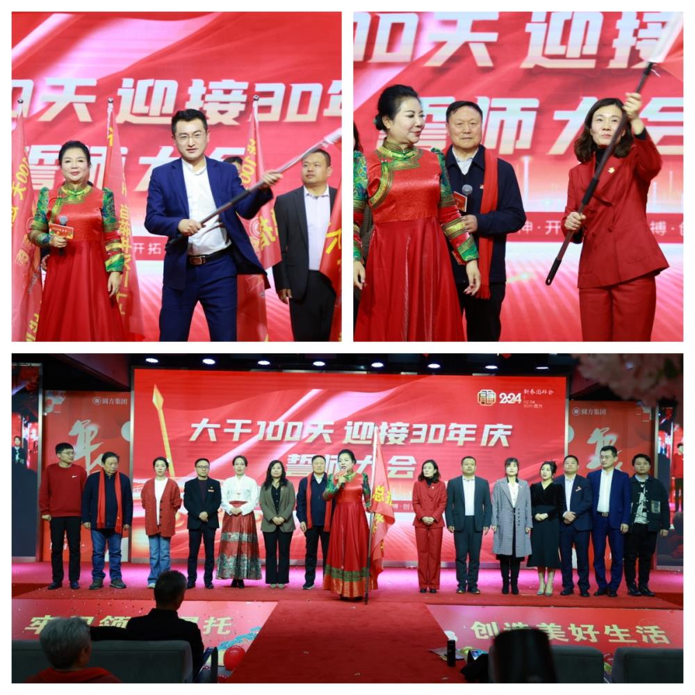 值得一提的是,團拜會(huì )還特別設置了30年誓師大會(huì )環(huán)節。薛榮上臺號召全體員工決戰100天,迎接30年,并于現場(chǎng)授旗。