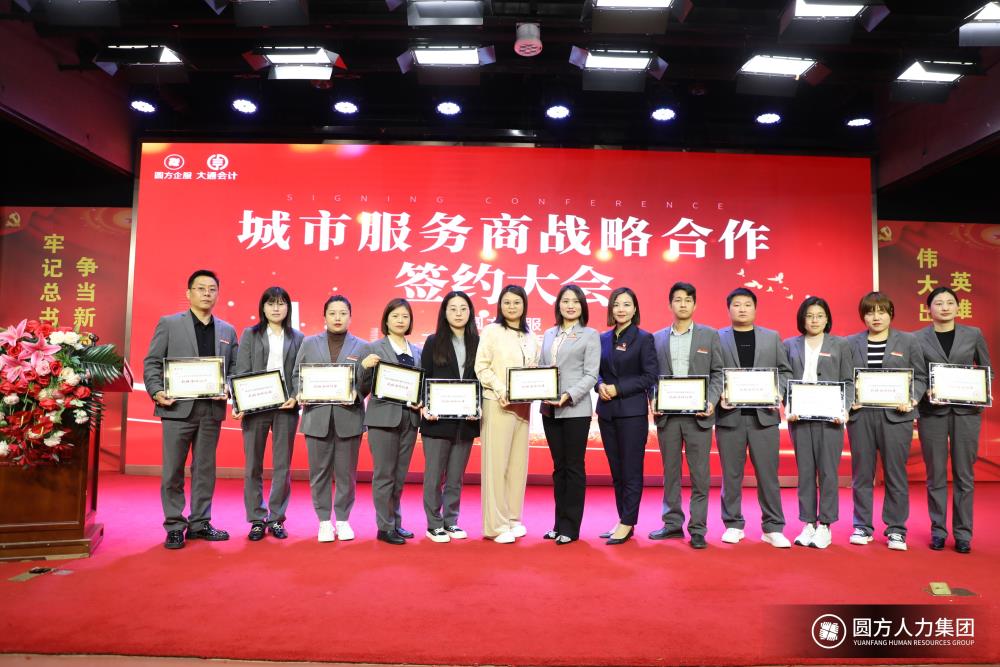 簽約授牌儀式上,圓方人力企服公司總經(jīng)理張芳,企服公司營(yíng)銷(xiāo)副總邵梅杰同河南大通集團董總簽訂了戰略合作意向,企服公司分別同河南大通集團多地區的11個(gè)分、子公司確定了戰略合作伙伴關(guān)系。